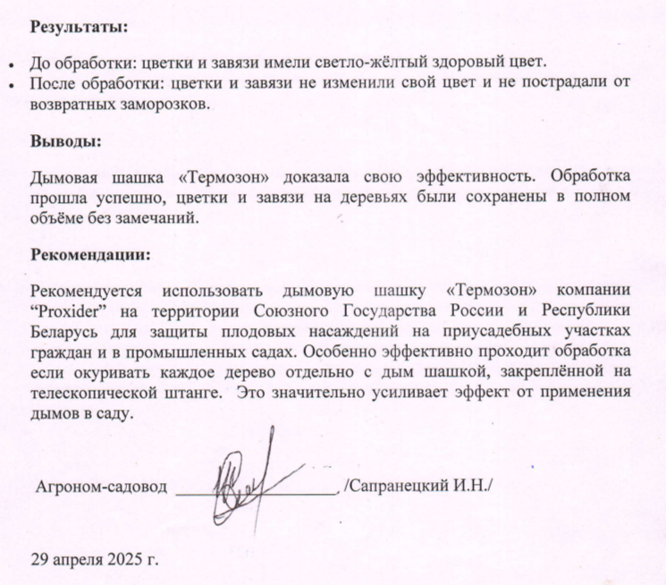 Наши союзные заказчики прислали подробный отчет по применению дымовой шашки TERMOZON на большом приусадебном хозяйстве во время возвратных заморозков в конце апреля, когда в Беларуси так же, как и в России были заморозки до -5 градусов. По результатам применения шашка "Термозон" доказала свою эффективность, цветки и завязи не изменили свой цвет и не пострадали.