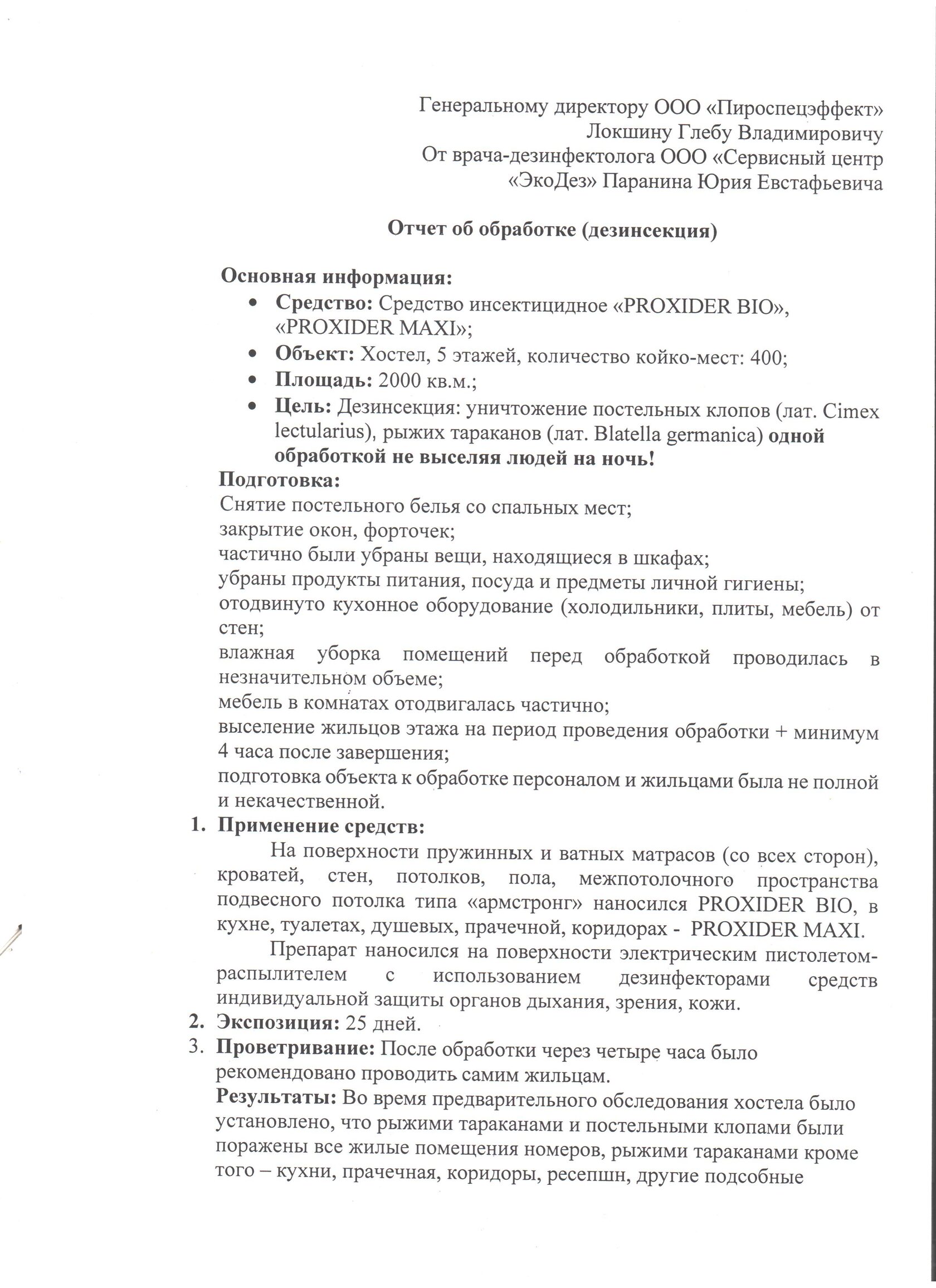 Специалистами ООО «Сервисный центр «ЭкоДез» при технической поддержке ООО «Пироспецэффект» была успешно проведена масштабная дезинсекция в пятиэтажном хостеле общей площадью 2000 кв.м. Несмотря на сложные условия и высокую степень заражения, обработка современными инсектицидными средствами «PROXIDER ВIO» и «PROXIDER МАХI» показала стопроцентный результат, позволив избежать полного выселения постояльцев на ночь.