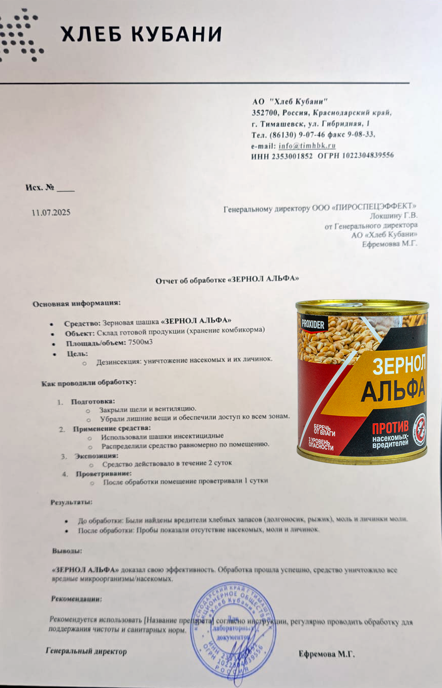 Специалисты АО "Хлеб Кубани" провели успешную обработку склада готовой продукции (хранение комбикорма) с использованием инсектицидной шашки «ЗЕРНОЛ АЛЬФА». Мероприятие было направлено на полное уничтожение насекомых-вредителей, включая долгоносика, рыжика мукоеда и личинок моли. Результаты подтвердили 100% эффективность препарата.