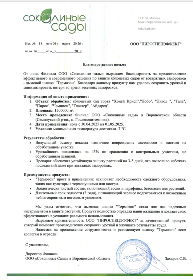 Получили благодарственное письмо от компании ООО "Соколиные сады" - средство "ТЕРМОЗОН" в очередной раз подтвердило свою эффективность при защите яблоневых садов от возвратных заморозков.
