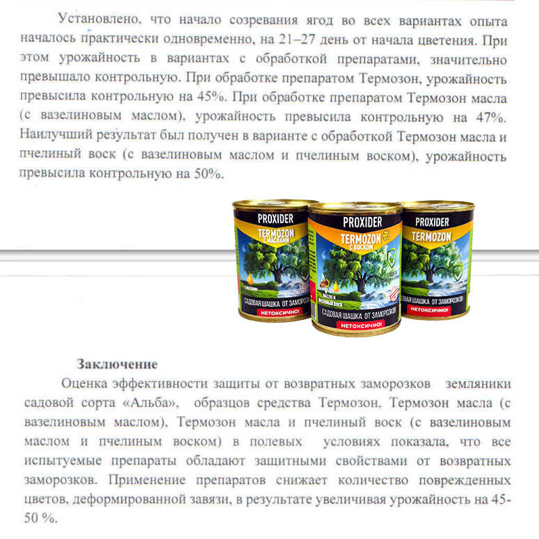 В ходе испытаний, проведенных Лазаревской ОСЗР (филиал ФГБНУ ФНЦБЗР), изучалось влияние дымовых шашек Термозон, Термозон масла (с вазелиновым маслом) и Термозон масла и пчелиный воск (с вазелиновым маслом и пчелиным воском) на землянику садовую сорта «Альба».